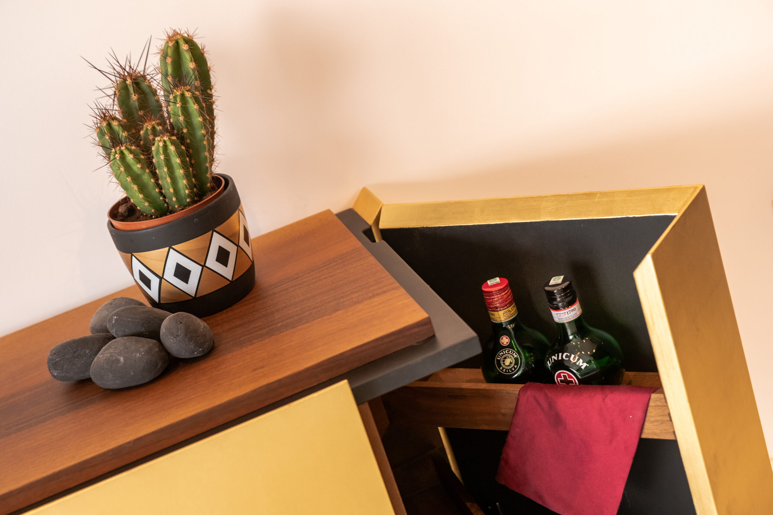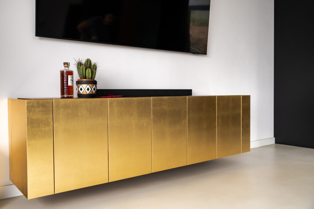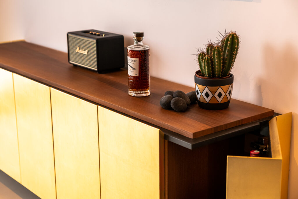 The walnut and lacquered top forms a clean, horizontal closure above the gold façade, balancing its intensity. Behind the front, a walnut interior emerges, with a rich grain and warm tone. The console combines enclosed storage with integrated bar compartments at the edges, organised within a compact and rational layout.