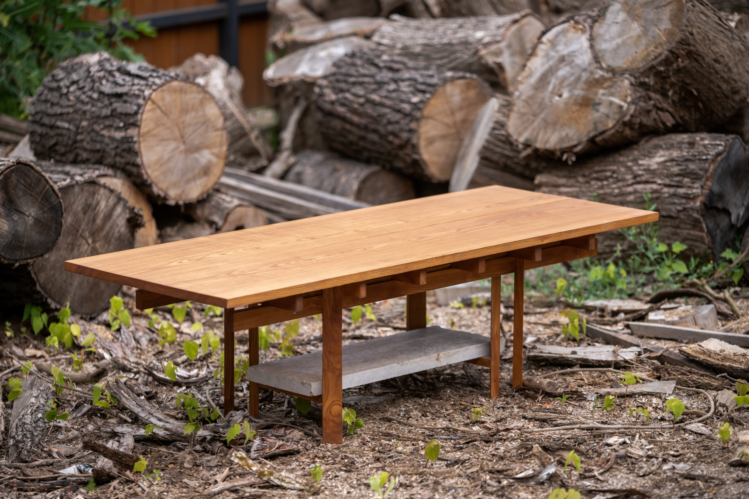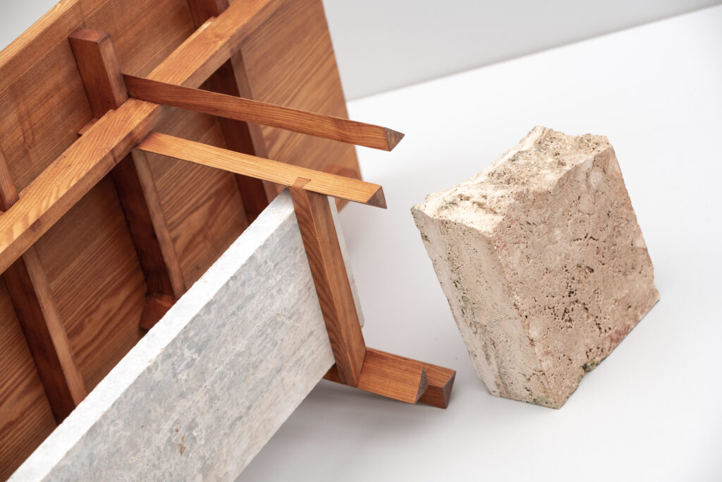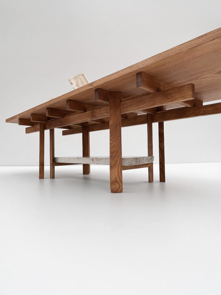 The piece is shaped by the intersection of traditional joinery and a contemporary approach to construction. Its solid wood structure is assembled through visible connections, where each element serves a clear purpose. The underlying support system is not concealed but expressed, allowing the logic of the object to remain legible. This structural clarity is paired with a modular mindset, enabling precise assembly and long-term adaptability.