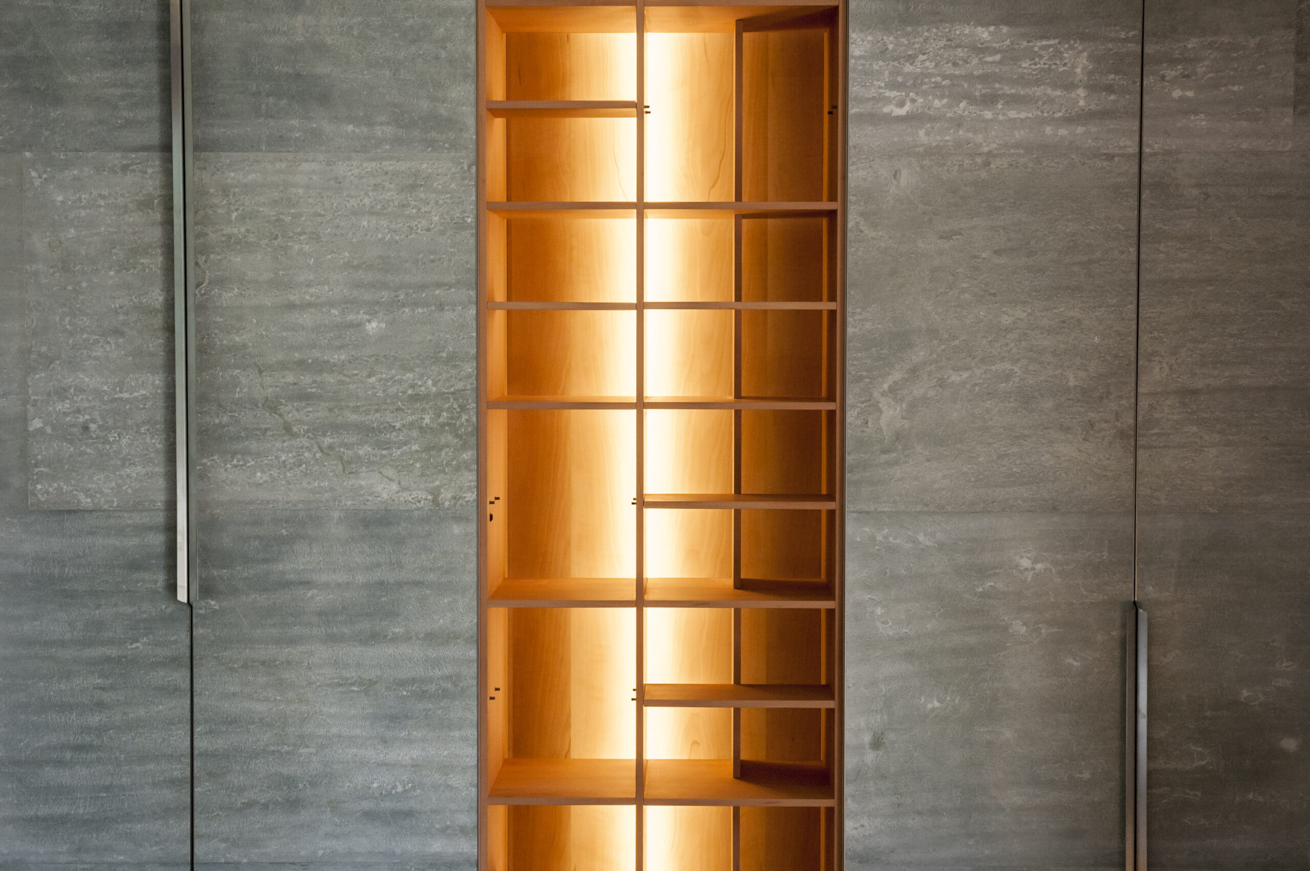 The internal wooden shelving system is freely reconfigurable, allowing for an organised yet varied arrangement of objects of different sizes. The stone veneer doors are framed by raw steel edges that maintain the continuity of the surface, while locally widening to allow access to the volume.