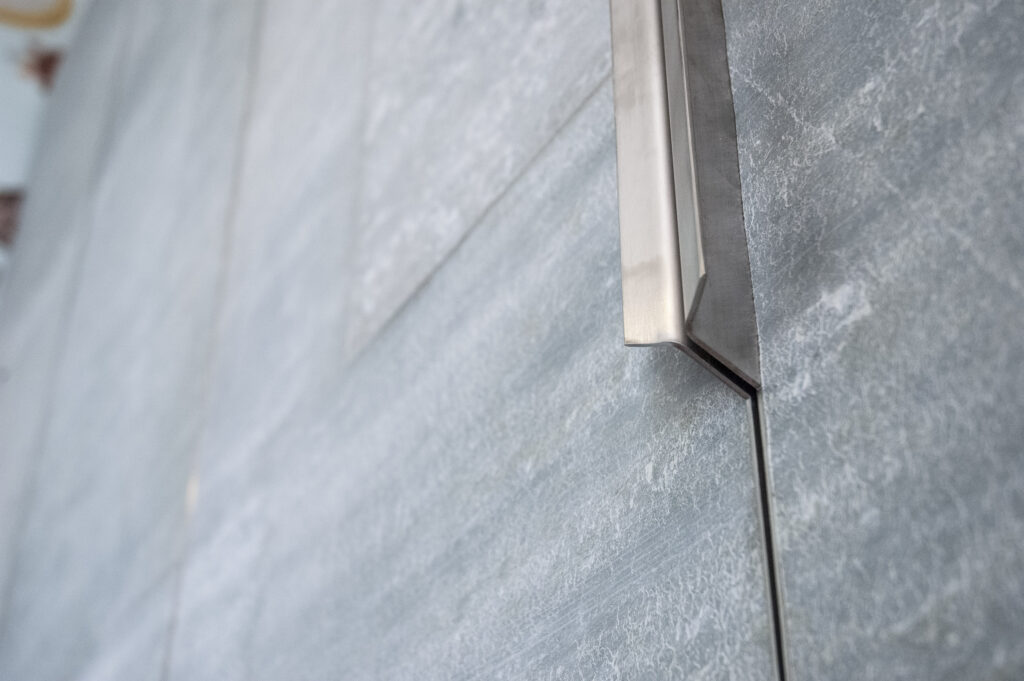 A surface that initially reads as a unified, closed mass. PALA stands as a calm, continuous façade — the natural grain of the stone veneer and the finely framed raw steel edges give it a restrained yet assertive presence. The surface does not fragment; instead, it opens at a certain point, as if the mass were separating, offering a glimpse into a warmer inner layer.