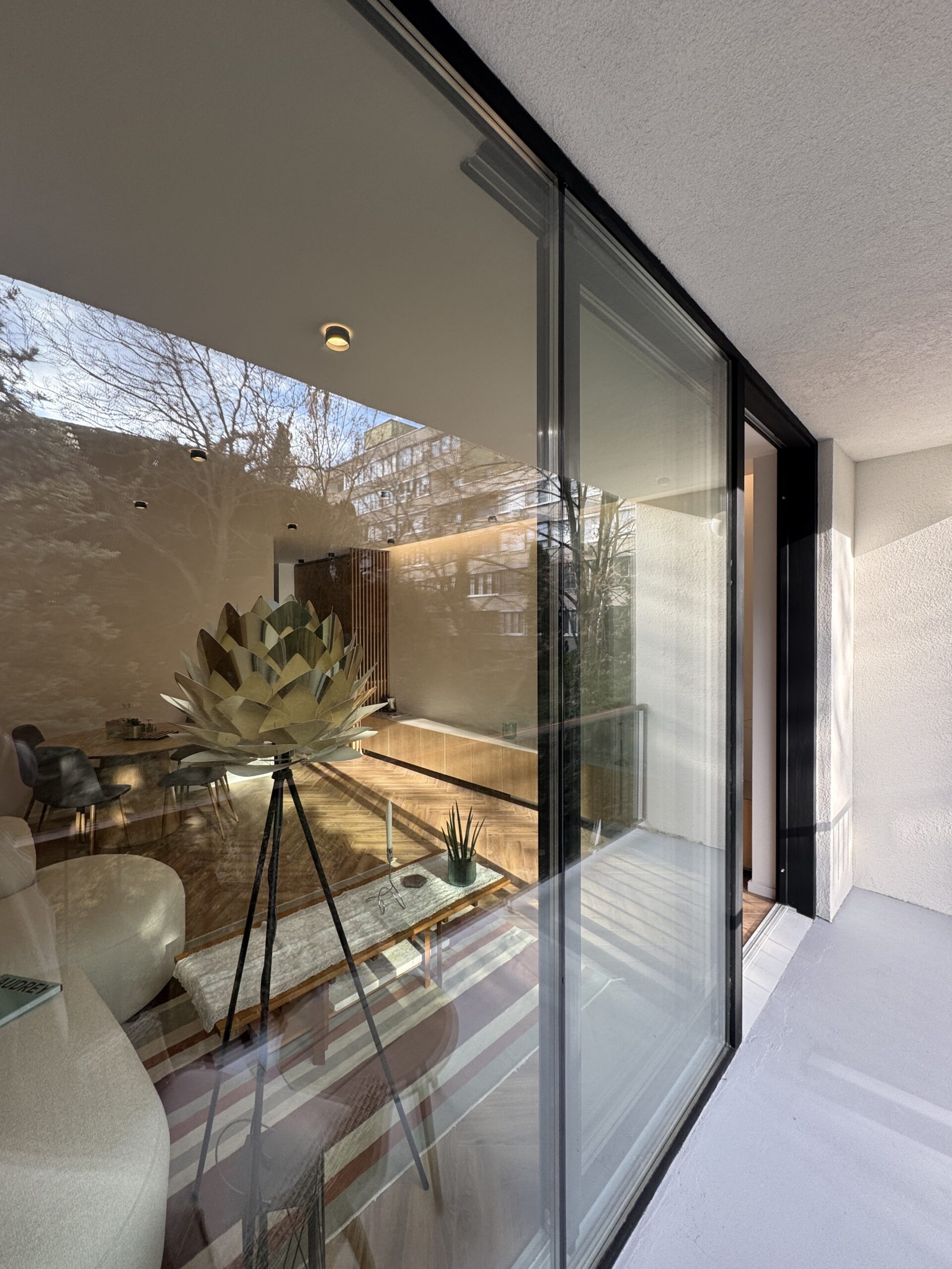The full-height sliding door visually and physically extends the living space towards the garden.